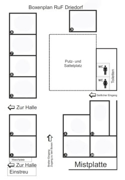 Zu unserer Anlage gehören eine Reithalle mit Boxen- und Paddockvermietung, ein Round-Pen, ein großer Rasenplatz und ein großer Aussenplatzmit Sand. Außerdem sind diverse Hindernisse zum Springen und für die Vielseitigkeit vorhanden. Natürlich gehört auch ein gemütliches Reiterstübchen dazu.